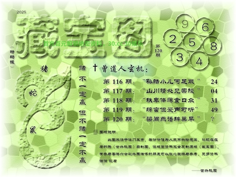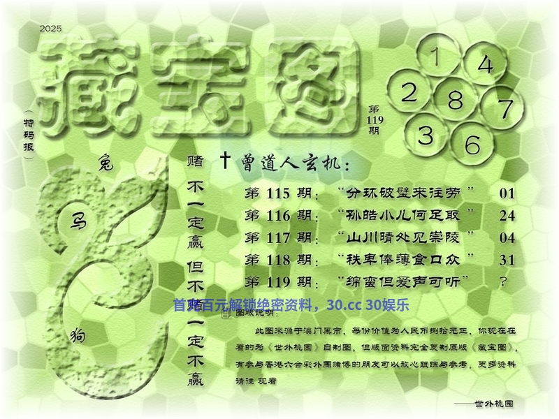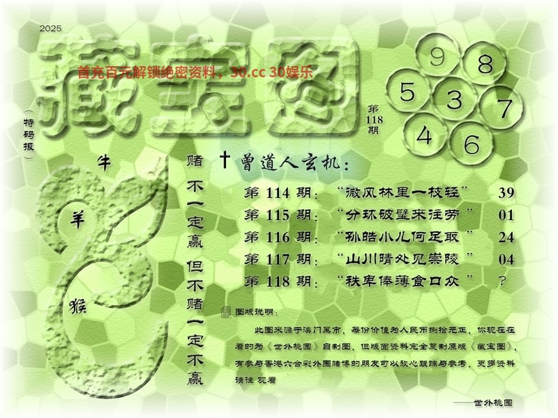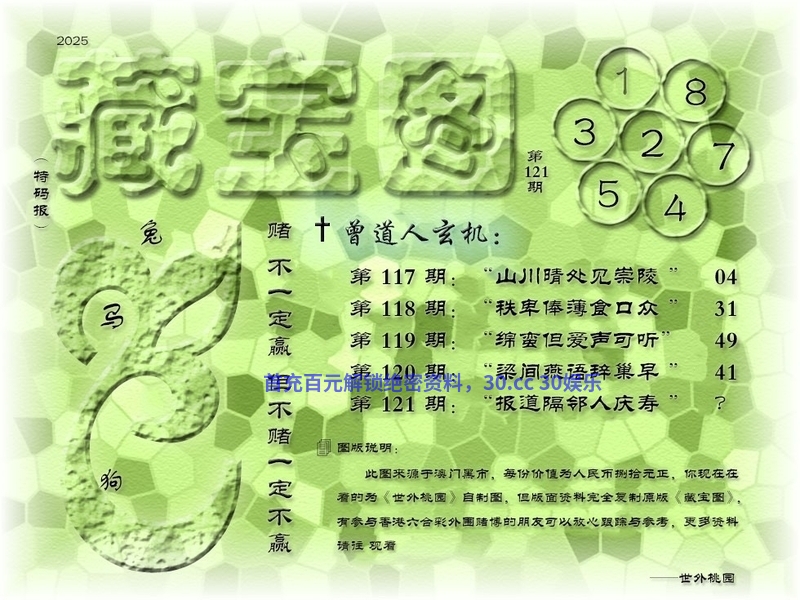 121期藏宝图:【报道隔邻人庆寿】 浅解:报道隔邻人庆寿,解吉美的生肖解兔龙蛇马羊鸡 综合生肖:羊猴猪牛鸡龙兔虎马 |